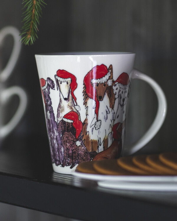 Upptäck våra unika porslinsmuggar med julmotiv av hundar i tomteluva, perfekta för att skapa den rätta julstämningen i hemmet! Varje mugg pryds av en charmig och detaljrik illustration skapad av designern Camilla Ståhl, känd för sina lekfulla och hjärtevärmande motiv.
