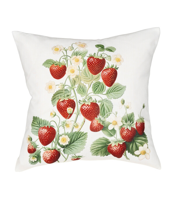 Underbart kuddfodral med ett lekfullt jordgubbsmotiv i härliga färger på vit botten – en söt detalj som sätter en somrig och glad prägel på ditt hem. Enfärgad vit baksida.