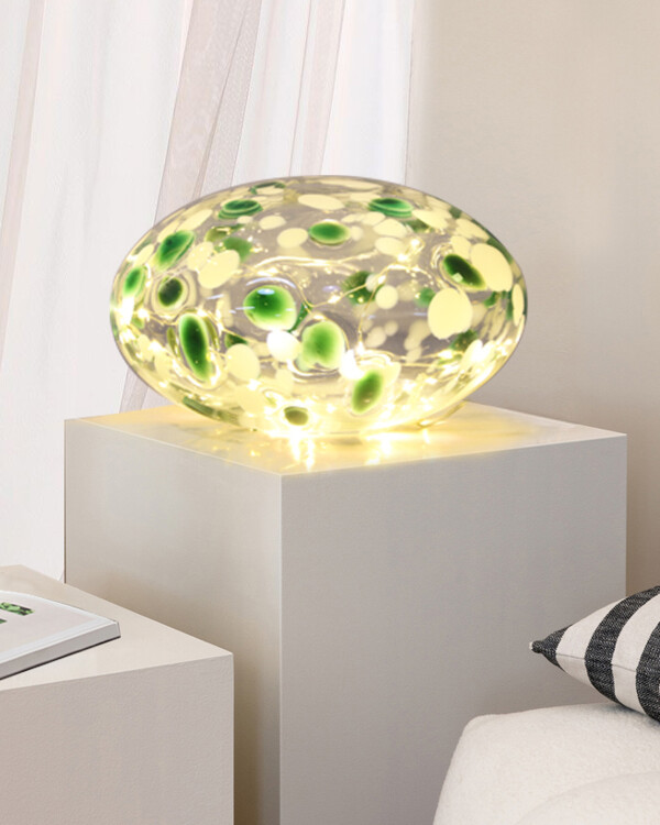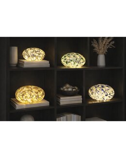 Den inbyggda LED-belysningen sprider ett mjukt och behagligt sken som framhäver glasets färgskiftningar på ett effektfullt sätt. Lampan är utrustad med både timer- och dimmerfunktion, vilket gör det enkelt att anpassa ljusstyrkan efter behov och skapa rätt atmosfär – från diskret mysbelysning till ett mer markerat stämningsljus.