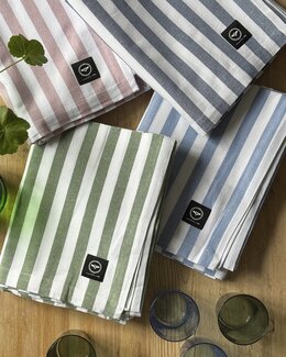 En vacker duk med breda ränder i vitt och rosa som ger dukningen ett lekfullt och elegant uttryck. Den harmoniska färgkombinationen skapar ett stilrent och inbjudande intryck, perfekt både till vardagsmåltider och festliga tillfällen. En dekorativ och praktisk detalj som lyfter hela bordsmiljön.