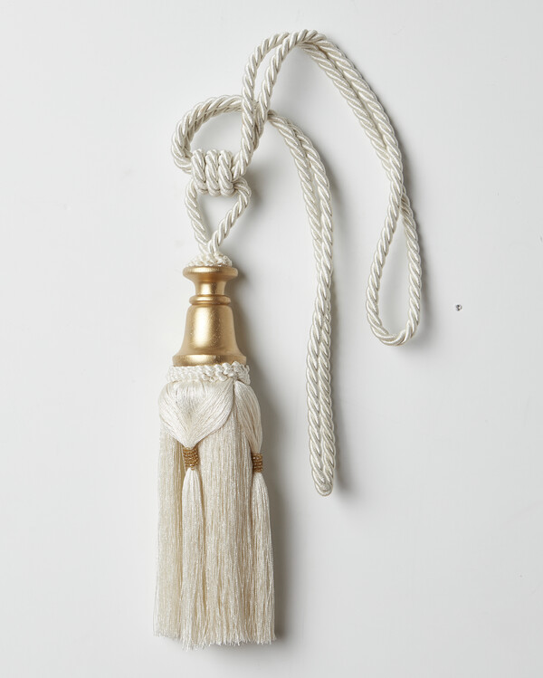 Tofsomtag, 100% polyester, längd 70 cm. Färg naturvit.