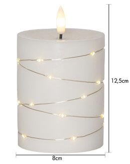 Skapa en stämningsfull och trygg atmosfär med vårt batteriljus i vitt stearin – ett elegant LED-ljus som kombinerar klassisk design med modern teknik. Det naturtrogna stearinljuset är dekorerat med en vackert lindad dew drop-slinga runt om, vilket ger ett mjukt, gnistrande sken och en exklusiv känsla i rummet.