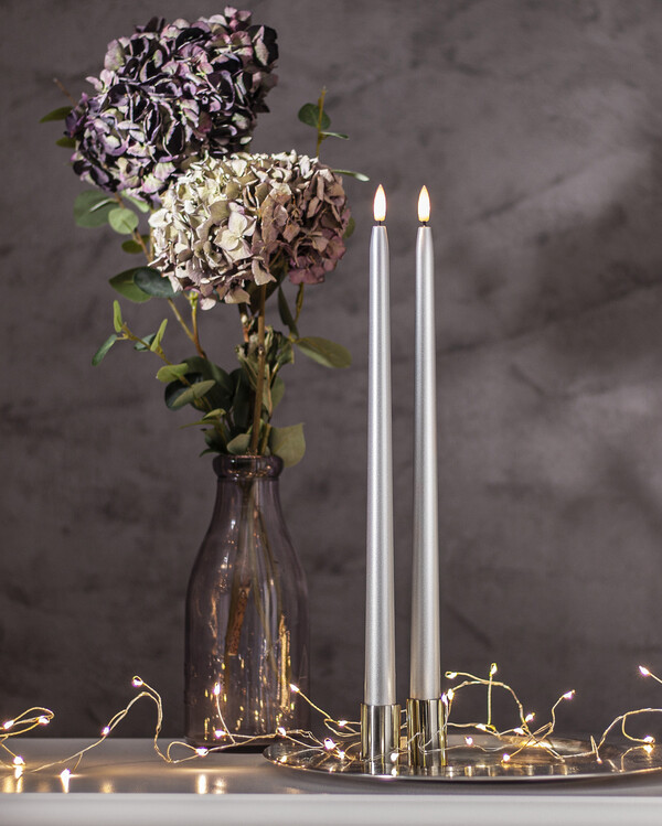 Ljusen har ett naturtroget, varmvitt sken som ger samma mysiga känsla som levande ljus – men utan brandrisk, rinnande stearin eller sot. Den stilrena formen med en diameter på 2,1 cm passar de flesta standardljusstakar, vilket gör dem enkla att kombinera med din befintliga dukning och inredning.